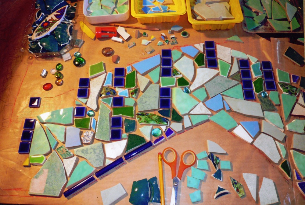 Damit das Kleben schneller geht, zeichne ich wieder das "L" auf Packpapier auf und lege die Scherben mitsamt den schon aufgeklebten Tropfen auf.