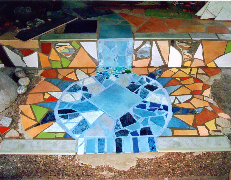 Den Stern verfuge ich dieses Mal mit blau eingefärbter Fugenmasse. Eigentlich ist sie mir nach dem Trocknen zu hell, aber inzwischen hat die Umwelt ihren Verdunkelungsprozess geleistet. Inwischen habe ich auch frostfeste rote Fliesen gefunden und kann diese vermehrt einsetzen. Rot lässt alle anderen Farben viel mehr leuchten.