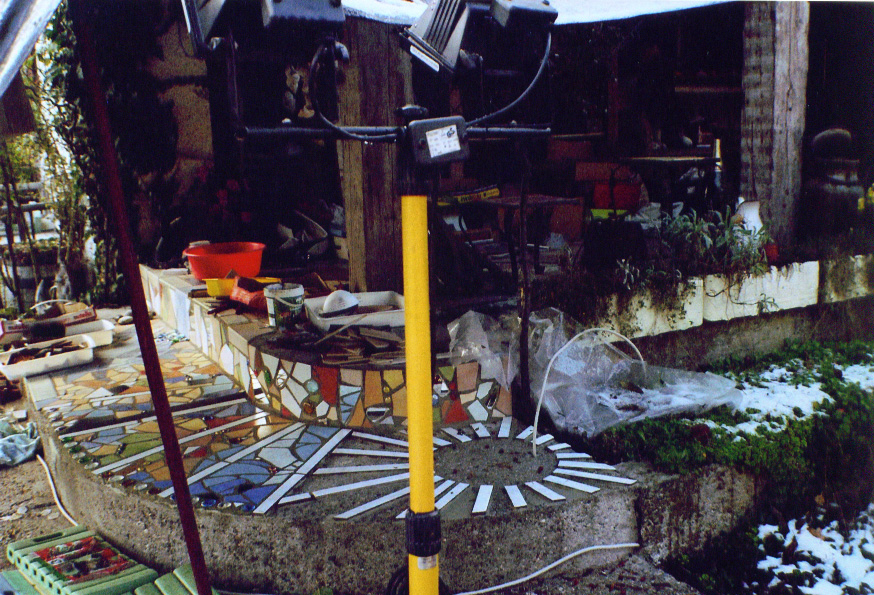 Wieder zu Hause lege ich sofort los. Es ist Ende Oktober und schon ziemlich kalt, es besteht die Gefahr, dass es Nachtfrost gibt. Ich lege die Fliesen aus und bis zum Abend habe ich es geschafft, alles aufzukleben. Dazu habe ich eine Plastiktüte über den Verband an meiner linken Hand gestülpt, die Fliesen verkehrtherum draufgelegt, den Mörtel draufgestrichen und dann die Fliese auf ihren Platz gelegt. In der darauffolgenden Nacht hatte es 5 Grad, das ging ja gerade noch. Sofort verfuge ich den geklebten Teil. Dann decke ich alles gut zu, denn ich traue den Temperaturen nicht