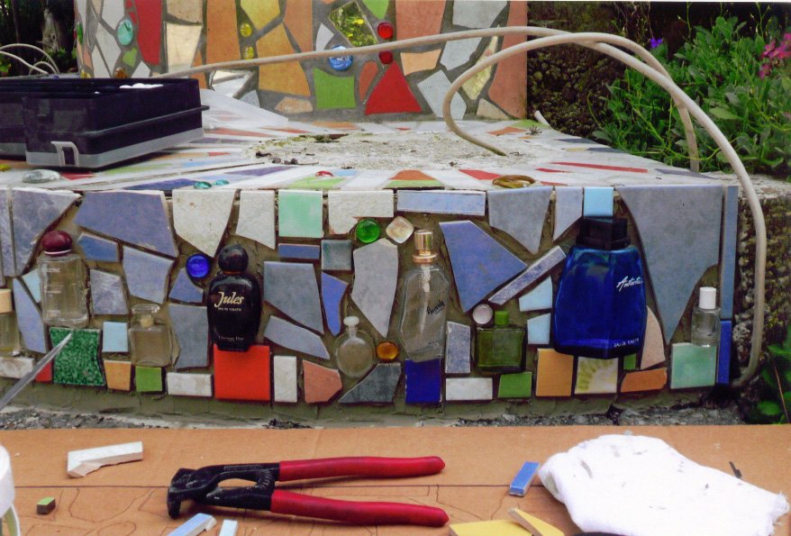 An Mosaiksteinen verwende ich diesesmal meine zusammengesammelten rechteckigen Fliesenstücke und baue sie so ein, dass sie wie kleine Sockel für die Parfumflaschen wirken. Das Stromkabel für meine Lichtsäule ist auch schon verlegt.