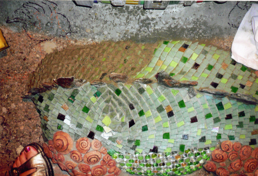 Dann geht es ans Verfugen. Da es am Tag über 30 Grad hat, wird die Masse zu schnell fest und jeden Abend hat es ein Gewitter. So passiert es, dass ich nicht mehr versäubern kann und fluchtartig meine Wirkungsstätte verlassen muss.