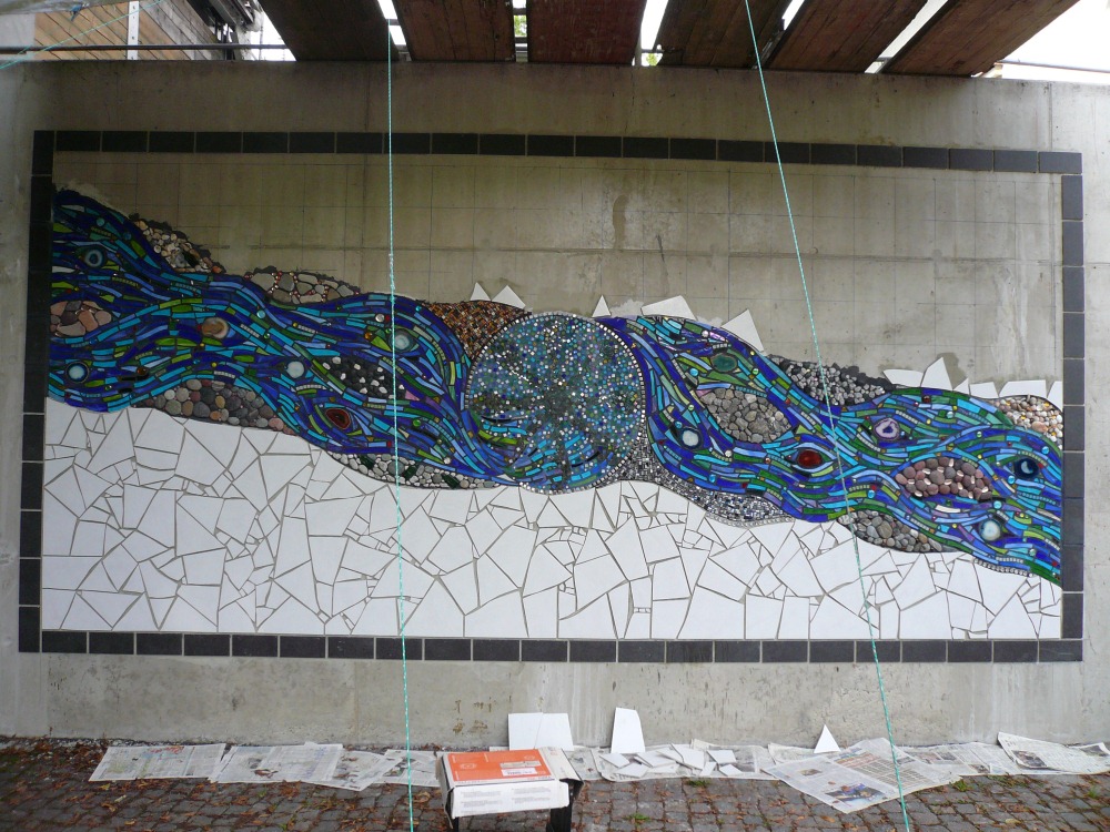 Genau passend gebogene Stücke kommen an die Kanten des Flusses.