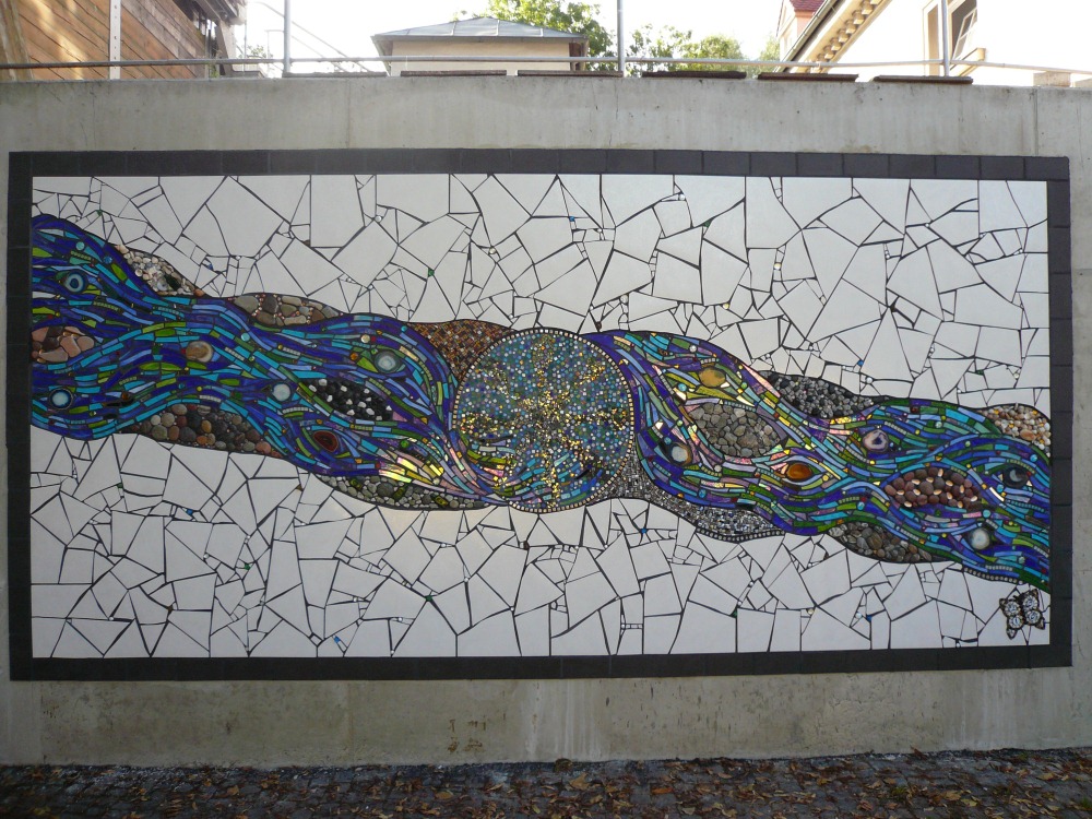 Jetzt habe ich zum erstenmal einen unverstellten Blick auf mein komplettes Mosaik und nutze das Abendlicht für das erste Foto des fertigen Werkes. Seit dem Schneiden des Glases sind 10 Monate vergangen, davon habe ich 55 Tage am Mosaik gearbeitet, und dabei 325 Arbeitsstunden zusammengebracht.